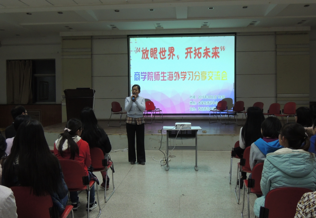 3月6日晚,公司在老员工活动中心一楼综合事务大厅举办了以“放眼世界,开拓未来”为主题的商公司师生海外学习分享交流会。刘敏副经理、周文杰博士、黄勇博士以及五位来自公司和教育公司、旅游公司赴海外学习的员工代表与在场同学们分享他们在海外学习的经历,就同学们的问题进行了详细的解答,公司2014级和2015级200多位同学参加了此次分享交流会。