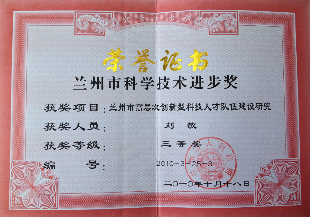 6.2010年,“兰州市高层次创新型科技人才队伍建设研究”项目获兰州市科学技术进步奖.