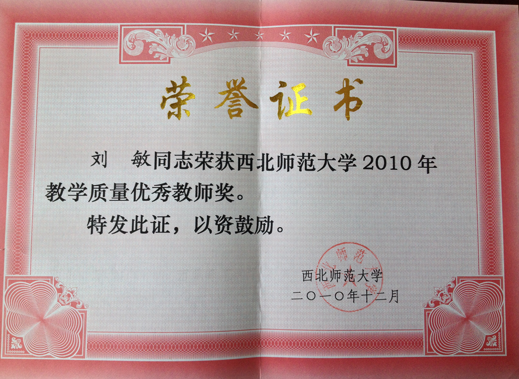 7.2010年,获韦德体育官方网站教学质量优秀教师奖.