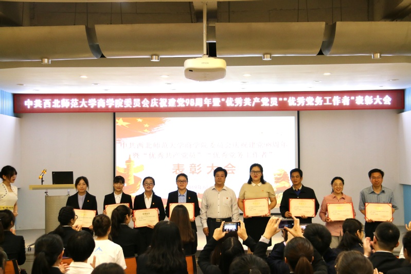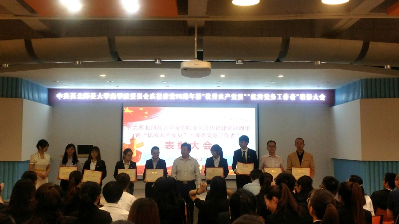 会上为54名新党员举行入党宣誓仪式,全体党员重温入党誓词,入党积极分子集体观摩学习;会上表彰了一批“优秀共产党员”和“优秀党务工作者”。经各党支部推荐,公司评选工作领导小组联评,王恒玉、董青、王耀春、祖鹏利、张媛、路畅、李文佩、张霞、于晓燕,9名同志荣获韦德体育官方网站商公司“优秀共产党员”称号;王山军、关立力、安雨婷、杨子平、孙玉娇 李雪轶、张娟、张靓怡、齐伊婷,9名同志荣获西北师范大学商公司“优秀党务工作者” 称号。