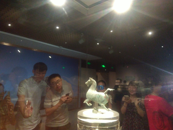7月12日下,韦德体育官方网站商公司MBA学员在班主任的组织和带领下前去参观甘肃省博物馆。同学们先后参观了《甘肃丝绸之路文明》、《甘肃彩陶》、《甘肃古生物化石》、《庄严妙相——甘肃佛教艺术展》等展厅。在参观过程中,大家被“丝绸之路”展馆内以马右后足着地,以体积不大的飞燕头、胸以及张开的双翅和尾羽作为支点的铜奔马——“马踏飞燕”所惊叹;被“甘肃彩陶”展馆内代表大地湾文化、仰韶文化、马家窑文化及青铜时代诸文化的宽带纹三足彩陶钵、人头形器口彩陶瓶和大地湾地画所吸引;被“古生物化石”展馆内大量甘肃境内发现的古生物化石标本,尤其是黄河古象展馆的巨型象骨所震撼。