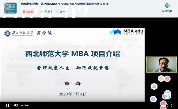 2020年7月4日下午,应中国MBA教育网邀请,韦德体育官方网站MBA中心参加了第四届全国MBA项目联展暨教授在线公开课(西北地区专场)。