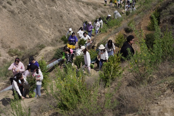 植树现场,师生们一起搬运树苗、铲土植树,一株株新栽的树苗,为新校区北山增添了绿意。