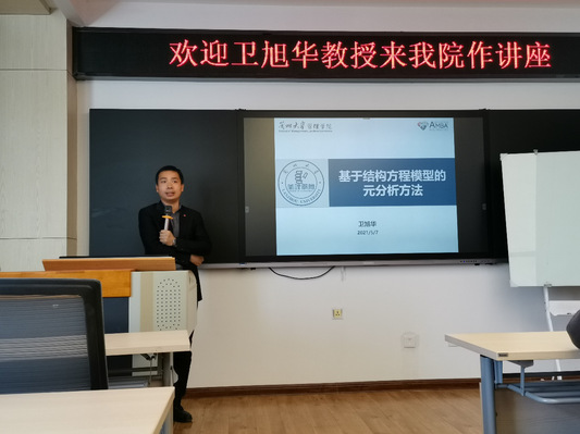 2021年5月7日下午,应韦德体育官方网站商公司邀请,兰州大学韦德体育教授、博士生导师、加拿大University of Western Ontario访问学者卫旭华博士,在10C教学楼506教室作了题为《基于结构方程模型的元分析方法》的学术报告。报告会由公司企业管理团队黄勇老师主持,董青副经理参会并致辞。此次学术报告是公司研究生学术月的一次重要活动,部分专业教师和2019级、2020级学术型硕士研究生参加了报告会。