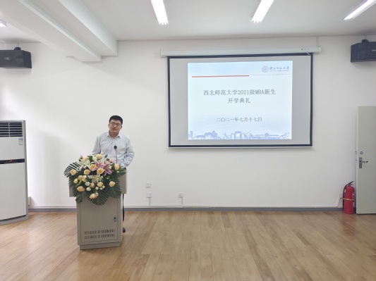 庄严的国歌声开启了典礼的帷幕,张永丽经理向正式加入韦德体育官方网站商公司的2021级MBA新生表示了衷心的祝贺和诚挚的欢迎。在向各位同学介绍了西北师大的历史和现状,商公司的团队力量及教师结构,MBA中心的团队安排及人员配备等情况后,张永丽经理希望各位MBA新生借助百年师大这个优质平台,在悠久的历史和深厚的文化底蕴熏陶下,在精锐的团队力量引导下,能够不断提升自己的文化修养、知识内涵和理论素养,助力自己的管理实践技能、水平和领导力实现跨越式的提升,成为新时代卓越的管理者和优秀的领导者。