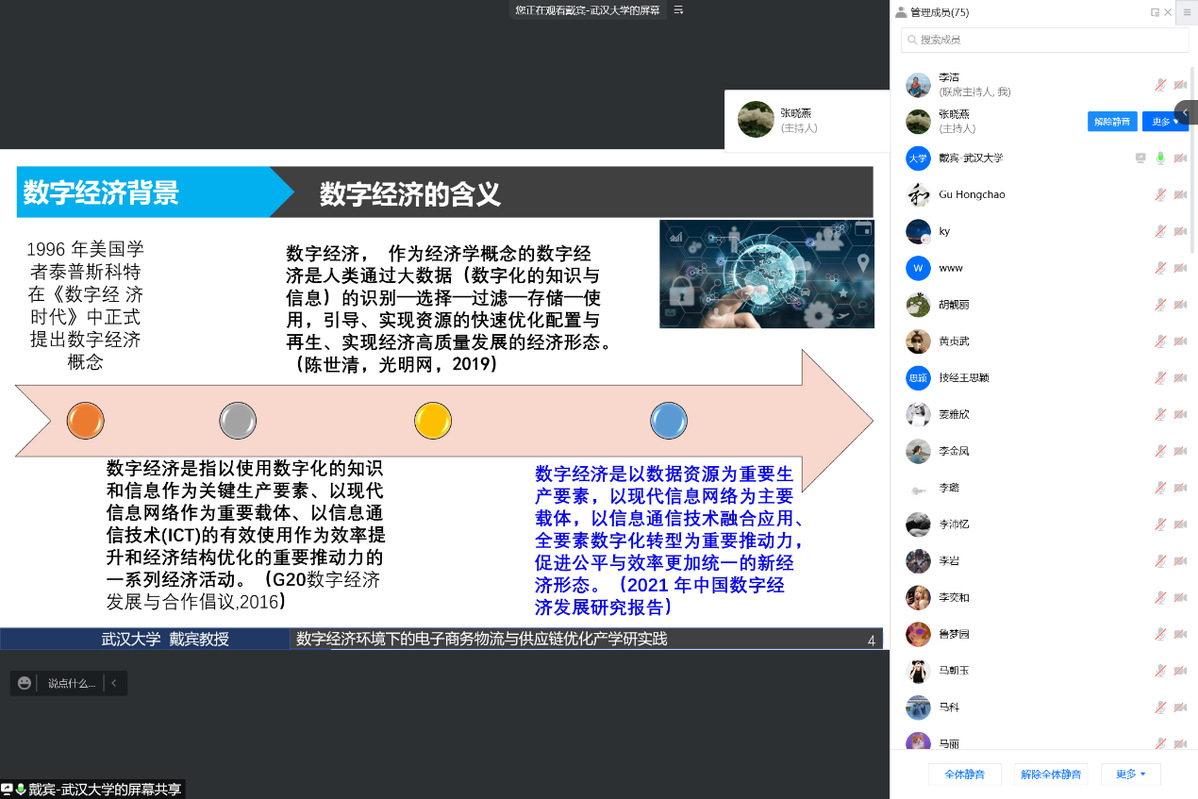 2021年11月15日,应公司邀请,武汉大学经管公司教授、博士生导师戴宾为公司师生在线作了题为《数字经济环境下电子商务物流与供应链优化产学研实践》学术报告。报告由信息管理系张晓燕副教授主持,公司领导、专任教师及研究生共100余人在线聆听了报告。