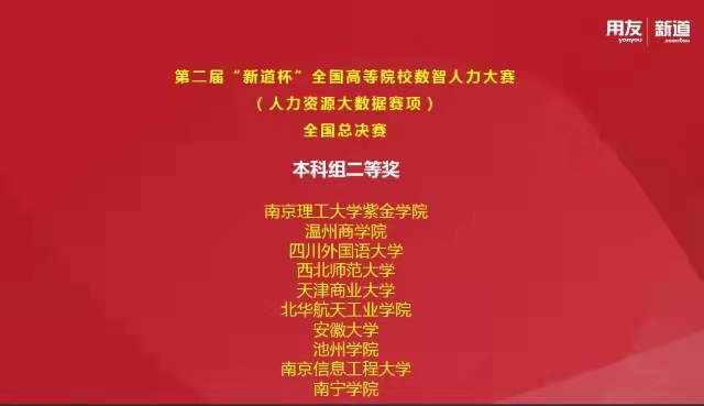 近日,第二届“新道杯”全国高等院校数智人力大赛(人力资源大数据赛项)全国总决赛结果出炉,由商公司教师马文静带队,本科员工刘力、宋佳琪、田润强、曹依涵组成的韦德体育官方网站本科组一队荣获全国总决赛二等奖。