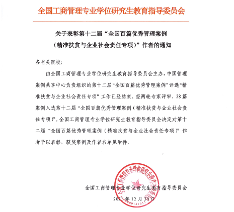 2021年12月30日,全国工商管理专业学位研究生教育指导委员会,对入选第十二届“全国百篇优秀管理案例(精准扶贫与企业社会责任专项)”的38篇案例作者进行了表彰,公司教师张晓燕与孙志忠撰写的案例《陇海之路:探寻农产品供应链扶贫金钥匙》入选。该篇案例,是公司第一篇入选的“百优案例”,对推进公司的案例开发工作具有重要意义。