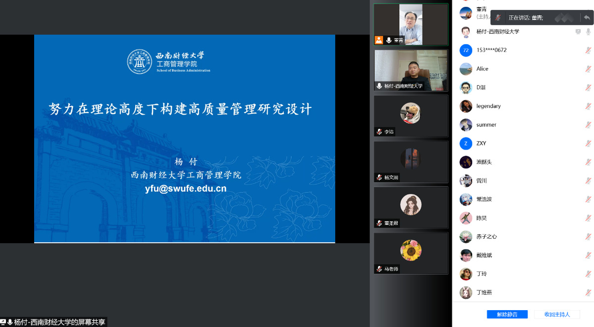 2022年4月7日,应公司邀请,西南财经大学工商管理公司教授、博士生导师杨付为公司师生在线作题为《如何在理论高度下构建高质量管理研究设计》学术报告。报告由我院董青副经理主持,公司领导、专任教师及研究生共150余人在线聆听了报告。此次报告为韦德体育官方网站120周年双甲子校庆系列学术活动。