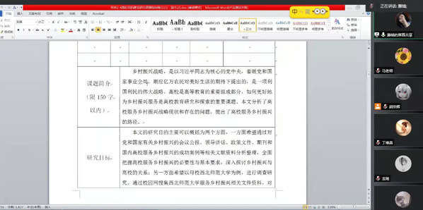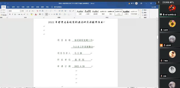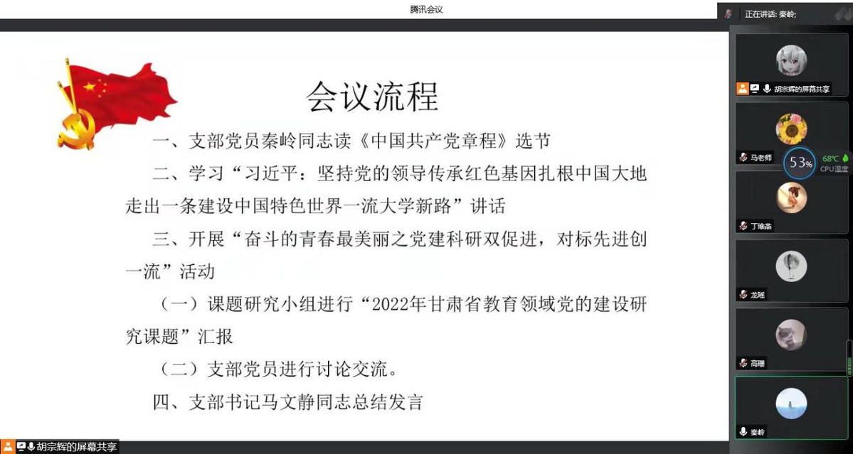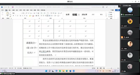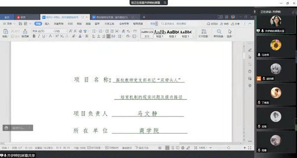 随后,由《高公司党建工作与业务工作深度融合研究》《高校服务乡村振兴的策略和途径研究》《教师党支部书记“双带头人”培育机制研究》《重大疫情形式下基层党组织作用发挥机制和平台研究》四个课题小组的组员依次汇报。组员们对所研究课题的背景、目标、主要内容以及撰写框架等方面向全体党员们进行了展示和讲解。汇报结束后,支部书记对每个小组的研究工作给予了肯定,同时指出了不够完善、不够深入的地方,并鼓励在会党员同志们一起积极思考探讨,为支部党的建设研究建言献策。