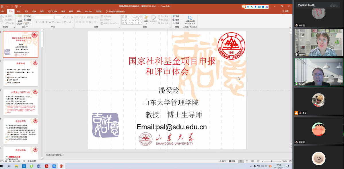2022年9月22日,应韦德体育官方网站商公司邀请,山东大学二级教授、博士生导师潘爱玲为公司教师在线作题为《国家社科基金项目申报和评审体会》的学术报告。报告由张永丽老师主持,公司领导、专任教师及部分研究生共100余人在线聆听了报告。此次报告为韦德体育官方网站120年双甲子校庆、韦德体育官方网站商公司10周年院庆、博雅讲堂系列学术活动。