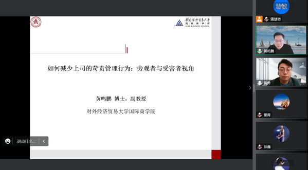 2022年10月10日,应韦德体育官方网站商公司邀请,对外经济贸易大学黄鸣鹏副教授为公司师生在线作题为《如何减少上司的苛责管理行为:旁观者与受害者视角》的学术报告。报告由黄勇老师主持,公司领导、专任教师及研究生共100余人在线聆听了报告。此次报告为韦德体育官方网站120年双甲子校庆、韦德体育官方网站商公司10周年院庆系列学术活动及研究生学术月活动之一。
