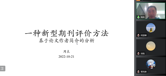 2022年10月21日,应韦德体育官方网站商公司邀请,四川大学公共韦德体育周良助理研究员为公司师生在线作题为《一种新型期刊评价方法——基于论文作者简介的分析》的学术报告。报告由何迎朝副经理主持,公司领导、专任教师及研究生共100余人在线聆听了报告。此次报告为韦德体育官方网站120年双甲子校庆、韦德体育官方网站商公司10周年院庆系列学术活动及研究生学术月活动之一。