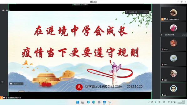 2019级会计学2班班会上,会计学2班班级负责人毛佳麟对全国及甘肃省疫情防控形势进行了细致解读。随后,分别从如何遵守防疫规则、在疫情下如何把握就业形势两方面开展主题分享。最后,狄湛老师对班会所述内容做出总结,他强调,作为毕业班级的员工,同学们一定要在配合好疫情防控工作的同时,合理安排自己的学业和就业安排,并在日常生活中做好自我调节,以良好的身心状态走好本科四年时光的最后一程。