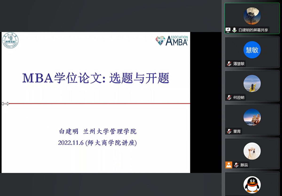2022年11月6日,应韦德体育官方网站商公司邀请,兰州大学韦德体育白建明教授为公司师生在线作题为《题好一半文:MBA学位论文选题与开题》的学术报告。报告由何迎朝副经理主持,公司领导、专任教师及研究生共210余人在线聆听了报告。此次报告为韦德体育官方网站120年双甲子校庆、韦德体育官方网站商公司10周年院庆系列学术活动及研究生学术月活动之一。