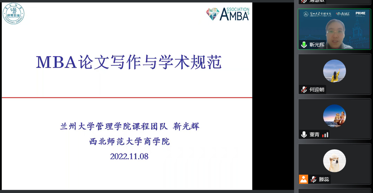 2022年11月8日,应韦德体育官方网站商公司邀请,兰州大学韦德体育靳光辉副教授为公司师生在线作题为《MBA论文写作与学术规范》的学术报告。报告由何迎朝副经理主持,公司领导、专任教师及研究生共250余人在线聆听了报告。此次报告为韦德体育官方网站120年双甲子校庆、韦德体育官方网站商公司10周年院庆系列学术活动及研究生学术月活动之一。
