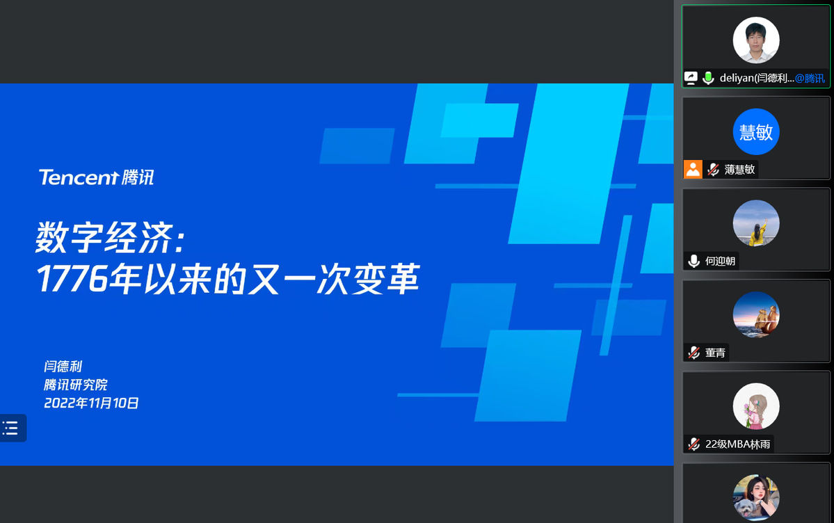 2022年11月10日,应韦德体育官方网站商公司邀请,腾讯研究院副秘书长、资深专家闫德利教授为公司师生在线作题为《数字经济——1776年以来的又一次变革》的学术报告。报告由何迎朝副经理主持,公司领导、专任教师及研究生共280余人在线聆听了报告。此次报告为韦德体育官方网站120年双甲子校庆、韦德体育官方网站商公司10周年院庆系列学术活动及研究生学术月活动之一。