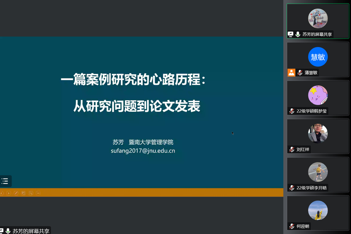 报告过程中,苏芳副教授首先宏观介绍了案例研究的实操步骤,分为:确定主题、企业调研、文献分析/数据预分析、明确研究问题和参照理论、更深入的数据分析、画研究模型、撰写论文;其次详细介绍了上述八个步骤的具体内涵以及在实践过程中的具体方法;最后结合本人所在团队近年来开展的相关研究,展示了单案例研究和双案例研究的过程。报告结束后,在线教师及研究生就如何借鉴已有研究中来优化模型、如何通过阅读文献来寻找研究缺口、案例研究的优势和难点有哪些、质性分析的软件等问题与余老师进行了互动探讨,苏老师均予以耐心、细致的解答。