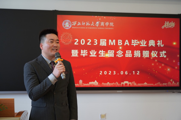董青经理为全体2023届MBA毕业生送上衷心祝贺并提出期许,希望广大毕业生们在未来的职业生涯和人生道路上继续牢记“知术欲圆,行旨须直”的校训、“弘道求是,知术乐商”的院训以及西北师大MBA人“管理改变人生,知行成就梦想”的精神理念,让自己的职业生涯和自己团队的职业生涯更加的顺利、卓越、更有成就,成为韦德体育官方网站最成功、最知名、最有成就的员工;他祝愿所有毕业生们扬帆起航、乘风破浪,用智慧、勇敢、行动去创造梦想,不忘初心、牢记使命,迎难而上,自强不息,带着120年西北师大的深厚人文底蕴去实现伟大的梦想,用所学所得回馈社会成就自己,他表示母校永远站在所有人身后喝彩、呐喊、加油,欢迎大家常回家看看。