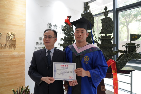 毕业典礼结束后,2023届毕业生向公司捐赠留念品,表达毕业生对母校和公司老师的感恩之情与精心栽培,愿公司争创一流;商公司经理董青接受现场捐赠,代表公司对捐赠回馈表示深深致谢。希望公司和毕业生们共同在新的起点上敢拼敢搏,大展宏图向未来。