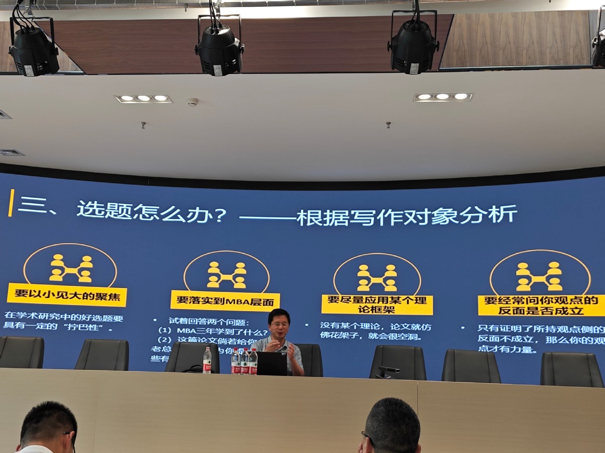 毕业论文是MBA培养过程中的关键环节,为提高论文质量,严把培养环节,商公司高度重视MBA论文撰写方法和技能的培训,刘海建教授从MBA论文撰写面临的挑战切入,重点从选题的三大忌、如何选题、MBA论文的特点以及撰写规范方面详细阐述了MBA论文不同部分的写作要点,并以发展战略主题为例,说明如何写好战略主题的毕业论文。报告结束后,刘老师针对员工的困惑进行了细致的解答,受到MBA学员的好评,此次报告为MBA新生正确认识毕业论文的要求,提升写作技能具有显著的促进作用。