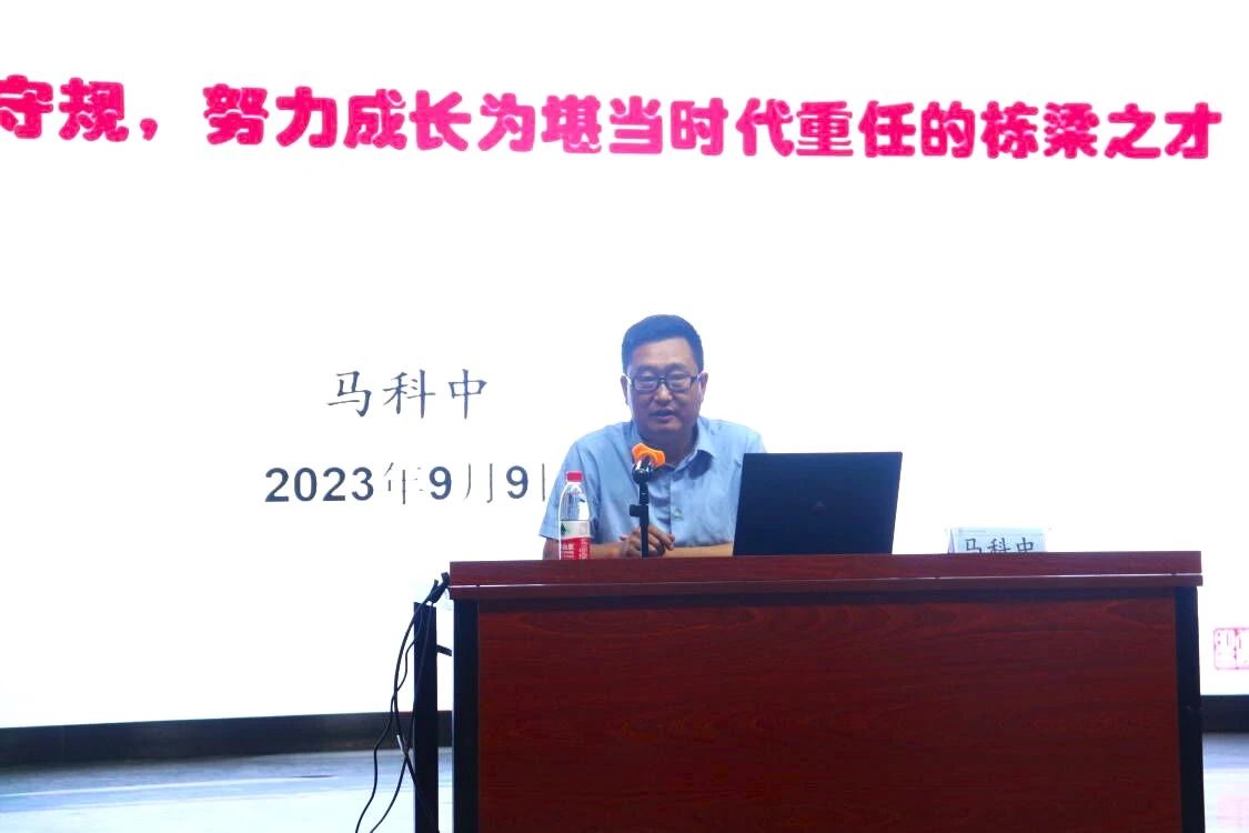 公司党委副书记杨国科做了网络意识形态安全教育、遵纪守法教育、安全防范教育等安全专题讲座,引导新生自觉遵守国家法律法规和校纪校规,牢固树立“安全第一”的思想观念。