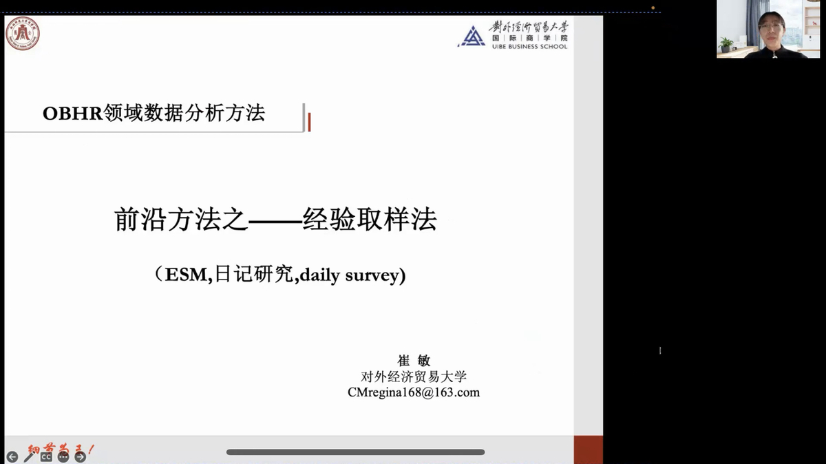 报告过程中,崔敏博士首先宏观介绍了OBHR领域所涉及到的11种数据分析方法;其次详细阐述了经验取样法的具体内涵、特征、类型、优势、适用范围,以及该方法在实践过程中运用范围,在此基础上,以已有文献为例分析了常见的多层模型和常见的经验取样模型;最后通过案例导入,运用Mplu和SPSS软件演示了经验取样的具体操作,并分享了关于日记研究的注意事项。报告结束后,在线教师及研究生就如何运用经验取样、相关领域知名学者常用计量方法、控制变量的设置依据、数据处理与分析等问题与崔博士进行了互动探讨,崔博士均予以耐心、细致的解答。