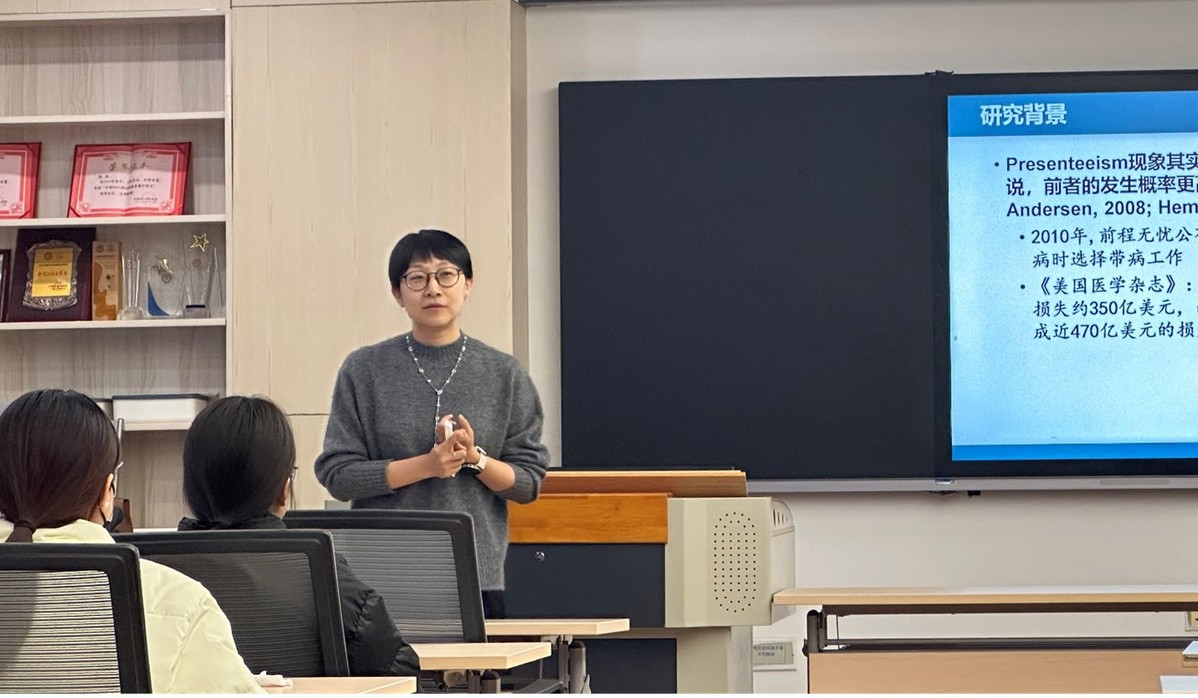 报告过程中,王艳霞副教授首先介绍了出勤主义和缺勤主义的来源和界定;其次详细阐述了出勤和缺勤对个人及组织分别有哪些影响,并结合实践经验介绍了两项研究的具体内容;最后得出研究结论——出勤主义可能在处理身体疼痛方面发挥积极作用,而社会痛苦(即排斥)往往会通过降低员工的自尊心来削弱这种积极作用。报告结束后,公司教师及研究生就研究过程中核心变量的选择、数据收集过程中指标选取原则等问题与王老师进行了互动探讨,王老师均予以耐心、细致的解答。