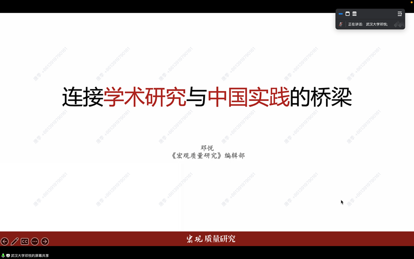报告过程中,邓悦老师基于武汉大学创办的期刊《宏观质量研究》,首先详细介绍了该期刊的发展历史及所获得的多项荣誉;其次立足中国高质量发展目标,围绕该期刊的热点选题,以中国消费质量、食品安全质量、乡村振兴、教育质量、公共服务质量为例详细分析了期刊的版块设置。最后以开辟新栏目,打造案例库为主题,阐述了区域公共品牌案例库和中国企业质量案例库的具体内容。报告结束后,在线教师及研究生就论文选题方向、审稿原则、审稿周期等问题与邓老师进行了互动探讨,邓老师均予以耐心、细致的解答。