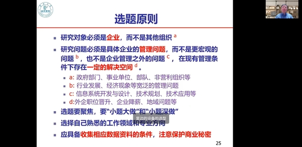 报告中,张若勇教授从MBA学位论文的政策背景、选题的现状与问题、选题的原则与要点、创新思路与方向等方面深度解读了MBA论文的选题策略。张老师从近年来国家对工商管理硕士学位论文的相关政策调整与导向,及教育部工商管理专业学位研究生教育指导委员会(简称“教指委”)发布的最新论文要求解读开始,认为这些政策不仅反映了国家对MBA教育质量的严格要求,也为学员们的论文写作指明了方向。随后,结合历年来指导员工的案例,深入剖析了当前MBA论文选题中普遍存在的问题,讲述了选题的来源和原则,鼓励同学们结合企业外部环境的新变化、新技术趋势、新场景的变化、转变研究体例的新交点,积极创新论文选题。