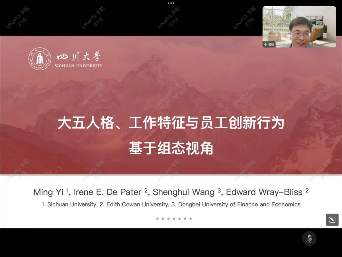 2024年11月8日,应韦德体育邀请,四川大学商公司特聘副研究员易明老师为公司师生在线作题为《大五人格、工作特征与员工创新行为:基于组态视角》的学术报告。报告由黄勇教授主持,公司领导、专任教师及研究生共110余人在线聆听了报告。此次报告是研究生学术活动月系列活动之一。