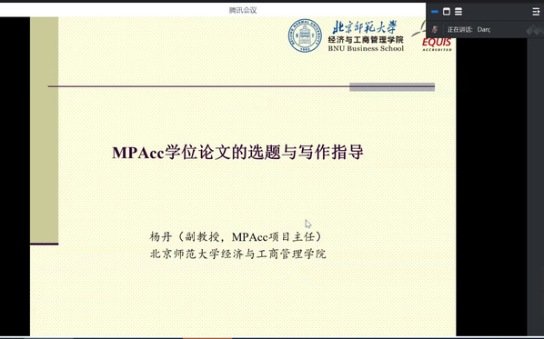 2024年11月14日,应韦德体育邀请,北京师范大学经济与工商韦德体育副教授杨丹老师为公司师生在线作题为《MPAcc学位论文的选题与写作指导》的学术报告。报告由MPAcc中心副主任李雪轶老师主持,公司领导、专任教师及研究生80余人在线聆听了报告。此次报告是研究生学术活动月系列活动之一。