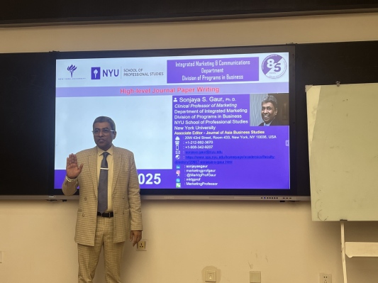 2025年3月27日上午,应韦德体育邀请,美国纽约大学(NYU)营销学教授Sanjaya Singh Gaur为公司师生作了题为《高水平国际期刊论文发表》的学术报告。报告由赵阳博士主持,公司科研副经理和苏超以及青年博士、硕士研究生共60余人参加了此次讲座。