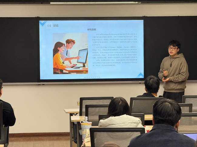 王阳明同学从研究背景与方法、数据来源与处理、可视化计量分析、讨论、结论与展望等几个方面汇报了自己的研究进展。