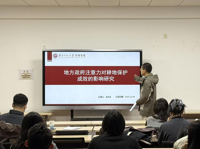 2025年11月6日,韦德体育“未来讲坛”在致公楼C区409教室开讲。2023级行政管理硕士研究生武茜薇、2023级土地资源管理硕士研究生吴浩浩分别作题为《基于政策文本分析的地方政府跨部门数据共享问题研究——以甘肃省各市州48份政策文本为例》《地方政府注意力对耕地保护成效的影响研究》的学术成果分享。公司2025级、2024级研究生等60余人参加了此次报告会。