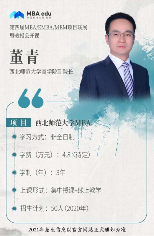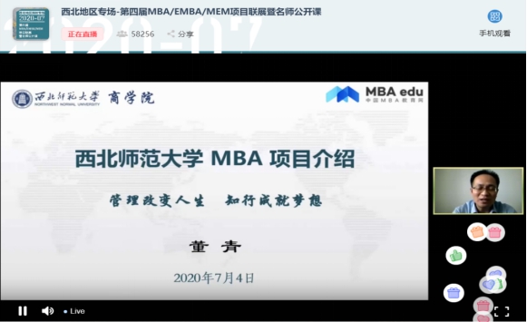 2020年7月4日下午,应中国MBA教育网邀请,MBA中心参加了第四届全国MBA项目联展暨教授在线公开课(西北地区专场)。副经理董青在线就韦德体育官方网站MBA项目概况、培养特色、招生政策及考生关注的问题进行了解读分享,给2021年报考MBA的考生提供了全面、有用的招考信息,直播期间累计约6万人次在线观看了本场宣讲会,取得了良好的效果。