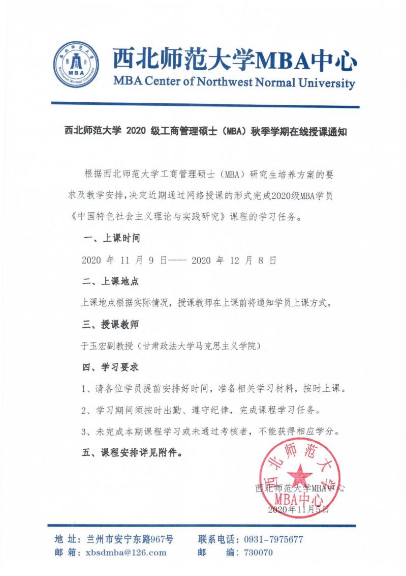 韦德体育官方网站 2020 级工商管理硕士(MBA)秋季学期在线授课通知