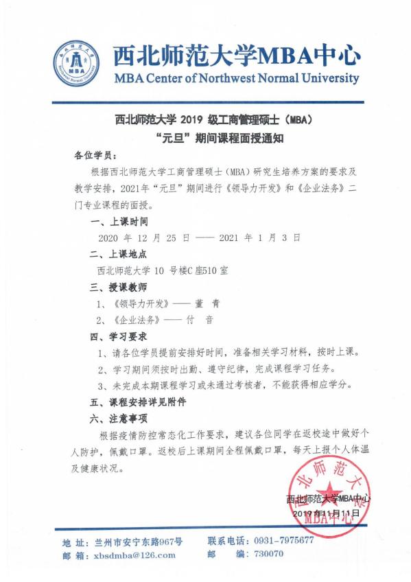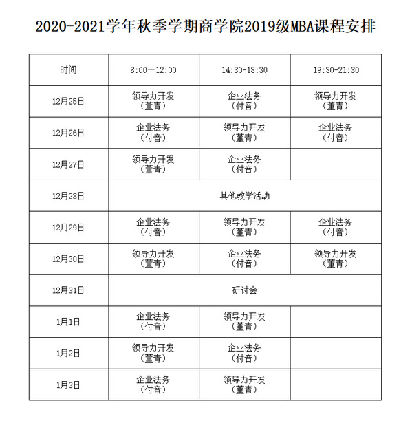 韦德体育官方网站 2019 级工商管理硕士(MBA)“元旦”期间课程面授通知