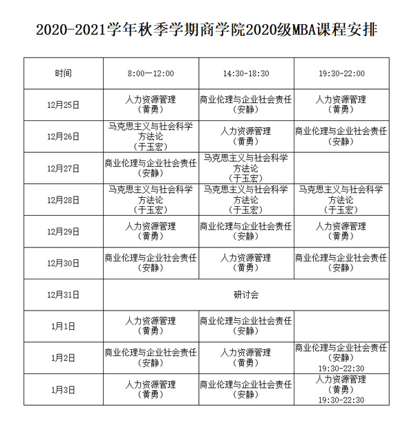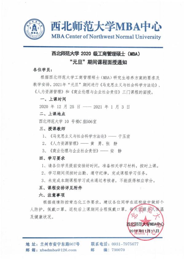 韦德体育官方网站 2020 级工商管理硕士(MBA)“元旦”期间课程面授通知