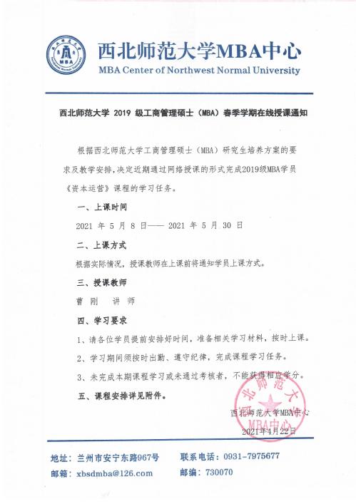 韦德体育官方网站 2019 级工商管理硕士(MBA)春季学期在线授课通知