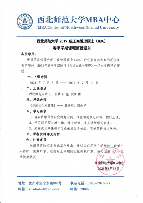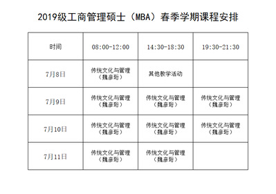 韦德体育官方网站 2019 级工商管理硕士(MBA)春季学期课程面授通知(二)