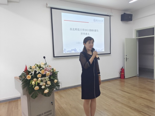 庄严的国歌声开启了典礼的帷幕,张永丽经理向正式加入韦德体育官方网站商公司的2021级MBA新生表示了衷心的祝贺和诚挚的欢迎。在向各位同学介绍了西北师大的历史、现状,商公司的团队力量及教师结构,MBA中心的团队安排及人员配备等情况后,张永丽经理希望各位MBA新生借助百年师大这个优质平台,在悠久的历史和深厚的文化底蕴熏陶下,在精锐的团队力量引导下,能够不断提升自己的文化修养、知识内涵和理论素养,助力自己的管理实践技能、水平和领导力实现跨越式的提升,成为新时代卓越的管理者和优秀的领导者。