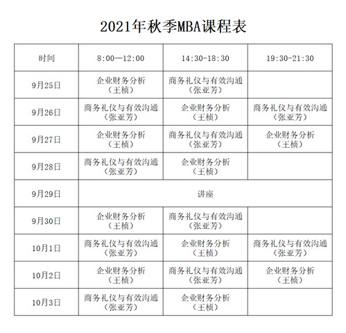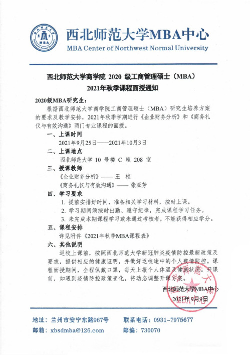 韦德体育官方网站商公司 2020 级工商管理硕士(MBA)2021年秋季课程面授通知