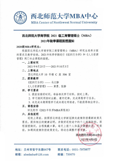 韦德体育官方网站商公司 2021级工商管理硕士(MBA)2021年秋季课程面授通知