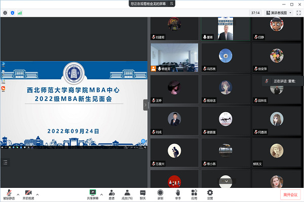9月24日上午,商公司2022级MBA新生见面会在线举行。商公司党委书记马科中老师、经理董青老师、副经理何迎朝老师、MBA项目主任黄勇老师出席见面会,2022级全体MBA新生在线参加,见面会由MBA中心主任杨金龙老师主持。