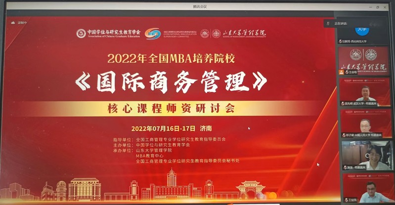 2022年7月16日至17日,由全国工商管理专业学位研究生教育指导委员会指导,中国学位与研究生教育学会主办,山东大学韦德体育、山东大学MBA教育中心、全国工商管理专业学位研究生教育指导委员会秘书处联合承办的全国MBA培养院校首届“国际商务管理”核心课程团队研讨会线上举行。来自全国100余所MBA培养院校的近150余名教师参加研讨会,商公司汪新民老师参加了本次研讨会。