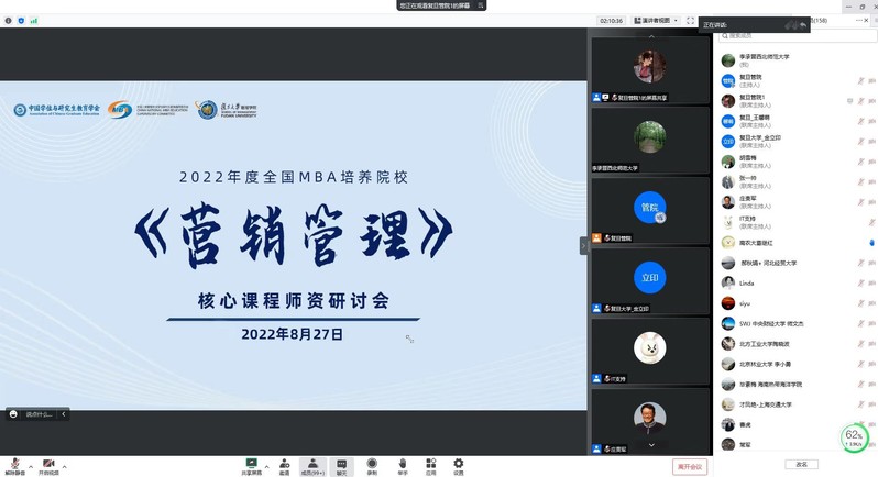 2022年8月27日,由中国学位与研究生教育学会、全国工商管理专业学位研究生教育指导委员会、复旦大学韦德体育共同举办的2022年度全国MBA培养院校“营销管理”核心课程团队研讨会顺利举行。公司何迎朝副经理、案例中心李承晋主任通过腾讯会议在线参加了本次会议。