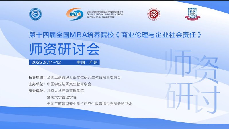 2022年8月11日至12日,由全国工商管理专业学位研究生教育指导委员会指导,中国学位与研究生教育学会主办,北京大学光华韦德体育、暨南大学韦德体育和全国工商管理专业学位研究生教育指导委员会秘书处承办的第十四届全国MBA培养院校“商业理论与企业社会责任”团队研讨会,在广州以线上线下相结合方式召开,全国108所高校的160余名教师参会,公司蒲赢健老师参加了本次会议。