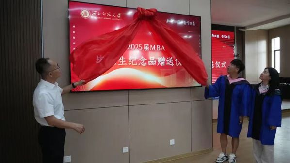 典礼最后,2022级MBA班班长廖军、李晨代表2025届全体MBA毕业生,为公司赠送留念品;董青经理代表公司接收捐赠并深表感谢,期待2025届MBA毕业生将学到的管理知识与智慧付诸于解决管理实践问题,在自己的工作岗位上建功立业、大展宏图。