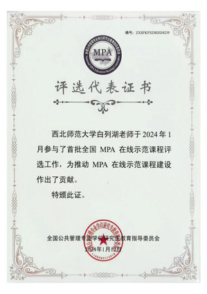全国公共管理硕士专业学位研究生在线示范课程,是由国务院学位委员会办公室统一布置和规划的专业学位类别研究生在线示范课程之一。本次课程评选活动旨在加强专业学位研究生课程建设、加快教育数字化转型、遴选出高质量、有创新、具实践价值的公共管理课程,以进一步丰富和完善MPA教育的课程体系,提升教学质量。